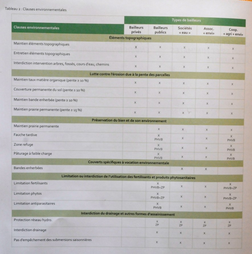La loi de 1969 ne prévoyait pas de clauses environnementales. La réforme de la loi en 1988 prévoyait la possibilité d’inscrire dans le bail la préservation des haies, arbres et chemins, mais ne prévoyait aucune sanction en cas de non-respect des clauses. La réforme actuelle du bail prévoit de renforcer ces dernières clauses grâce à l’état des lieux, et prévoit l’établissement deux types de clauses visant à lutter contre l’érosion des sols. Les sanctions sont renforcées.